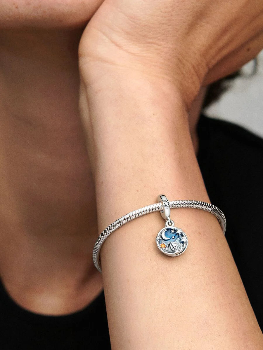 Transport yourself to a peaceful landscape with this sterling silver camping double dangle charm which features one openwork disc depicting a tent and stars, with a cosy campfire set with an orange cubic zir...