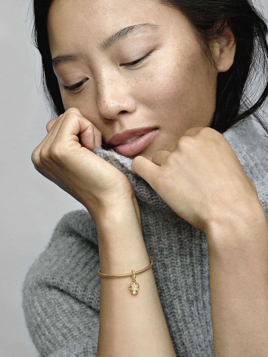 Embrace the nostalgia of festive days of old with the Heart Snowflake Snow Globe Dangle Charm. Plated in 14k gold, this Murano glass snow globe charm features engraved snowflakes that capture the beauty of a...