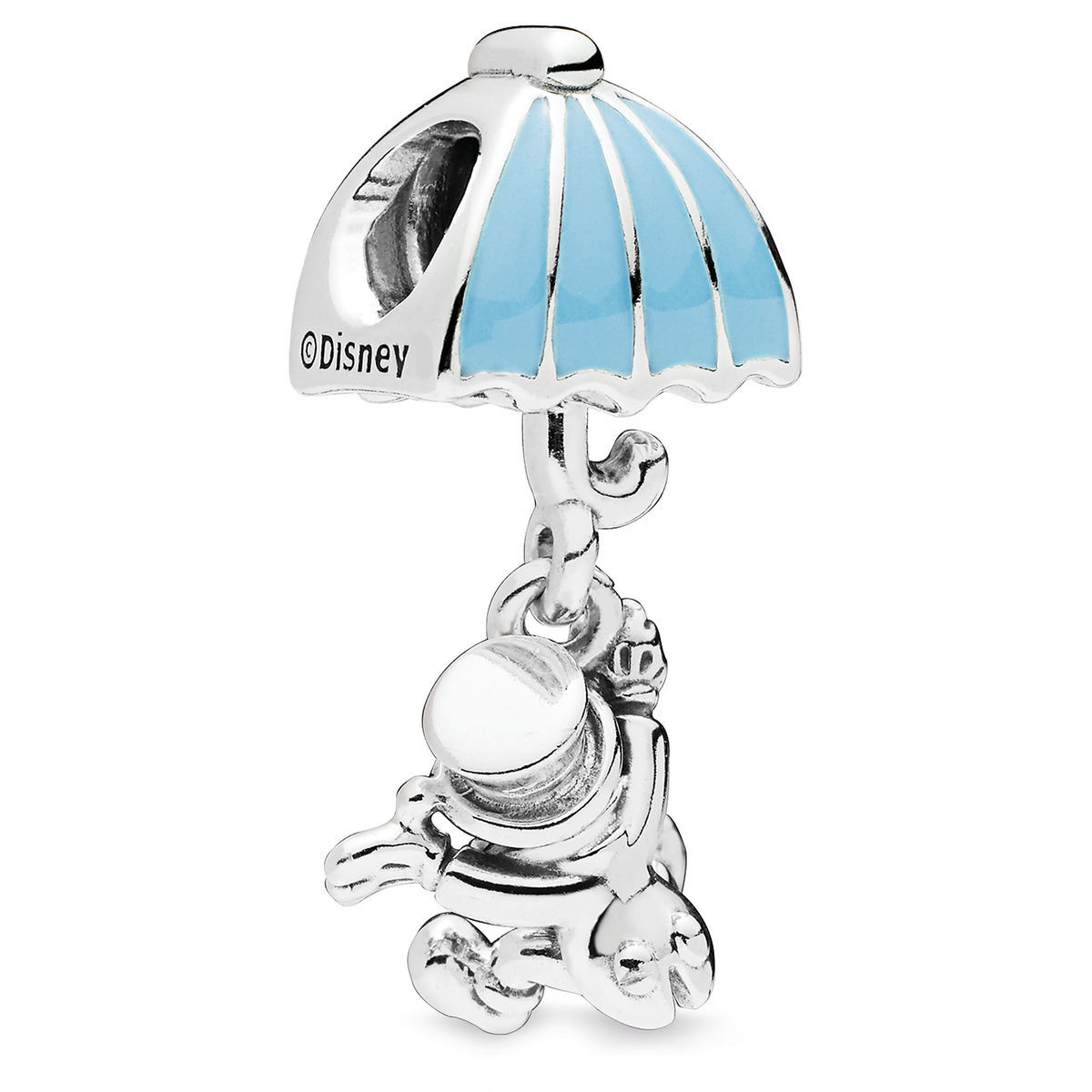 Jiminy Cricket, the conscience of Pinocchio, hangs beneath an umbrella on this delightful charm by PANDORA. The figural design of the comical and wise character is crafted in sterling silver and accented with blue enamel.