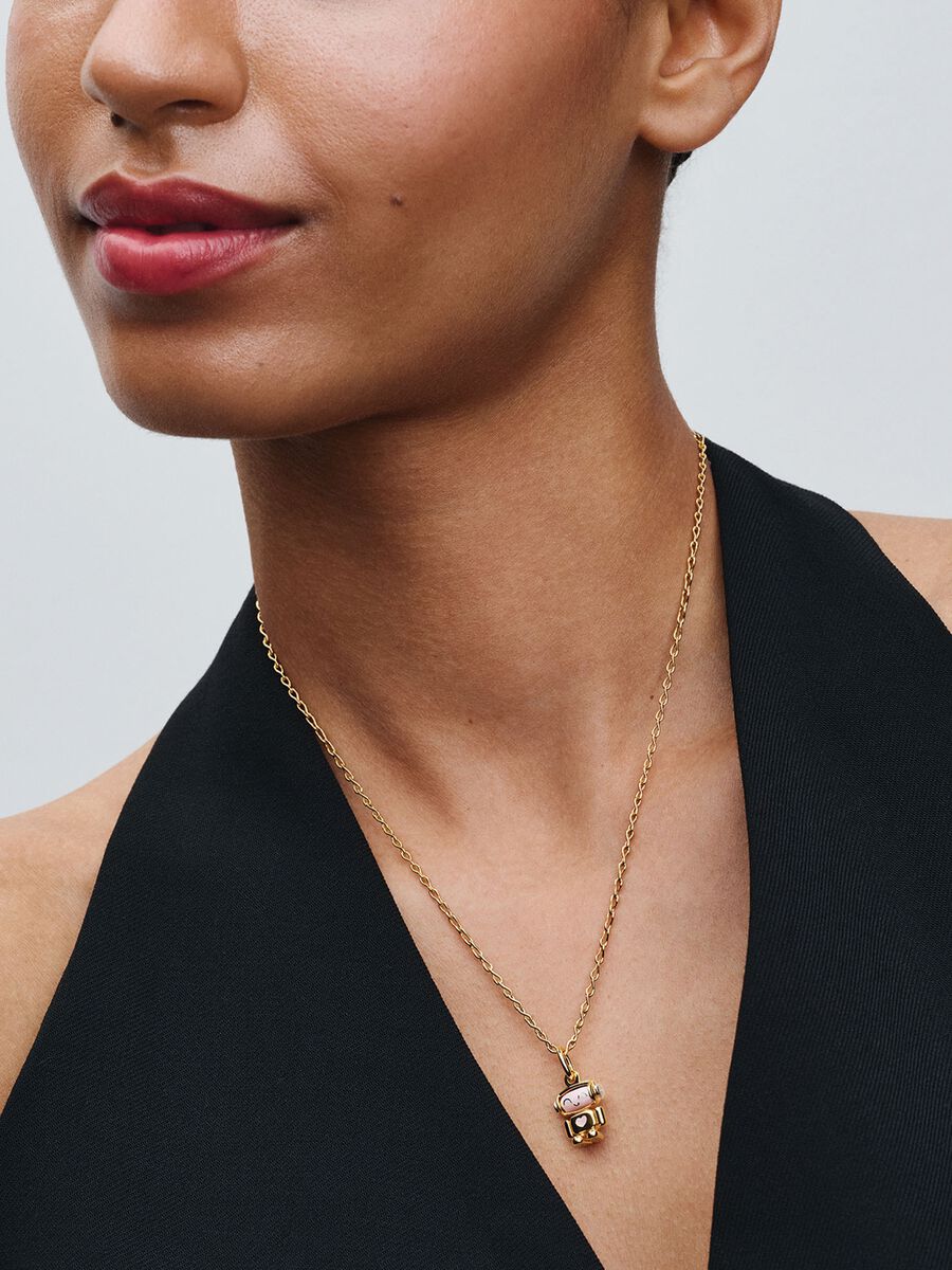 Who says robots don't have feelings? Our sterling silver and 14k gold-plated robot has changeable facial expressions and a shimmering pink enamel heart hand-painted on their chest.